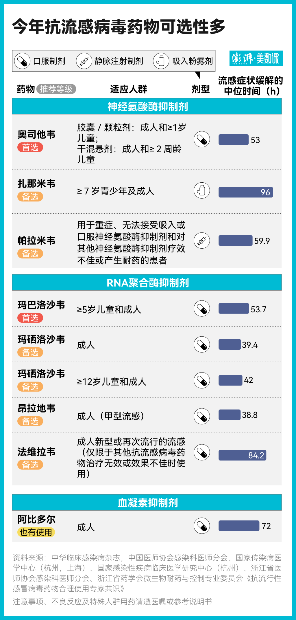 根据2025年8月出版的《抗流行性感冒病毒药物合理使用专家共识》,目前我国被批准用于临床治疗季节性或大流行流感的药物包括神经氨酸酶抑制剂(NAI)奥司他韦、扎那米韦、帕拉米韦,RNA聚合酶抑制剂(RNAPI)玛巴洛沙韦、玛舒拉沙韦、玛硒洛沙韦、昂拉地韦、法维拉韦和血凝素抑制剂(HAI)阿比多尔。