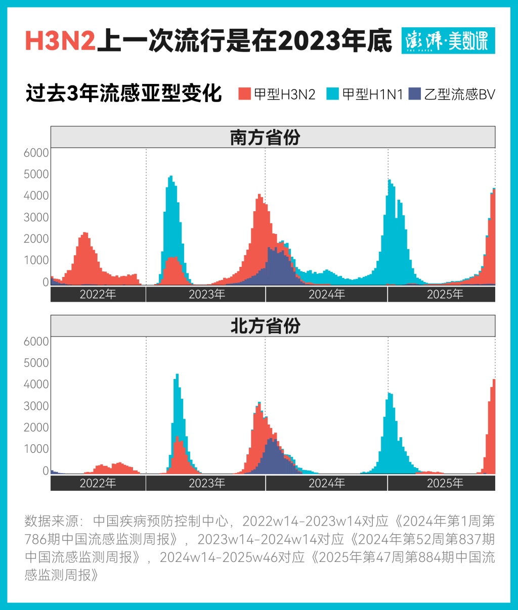 从2025年第47周的流感样病例报告来看,南方省份哨点医院报告的流感样病例ILI%为7.8%,高于前一周6.8%的水平,也高于2022年和2024年同期水平。北方省份流感样病例ILI%为8.6%,略高于南方,也高于2022年、2023年和2024年同期水平,逼近2022-2023年的峰值水平。