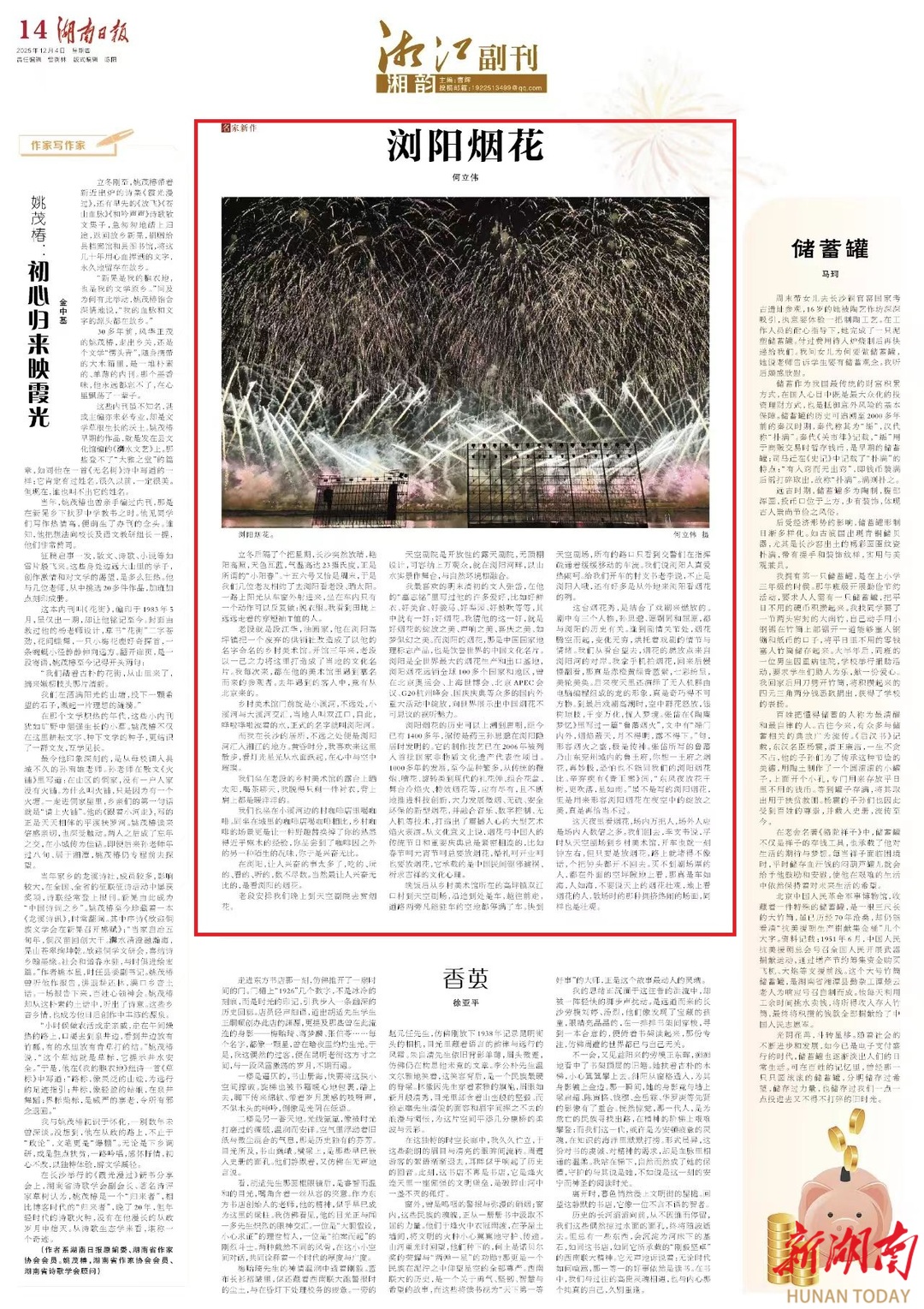 我最喜欢的明末清初的文人张岱,在他的“墓志铭”里写过他的许多爱好,比如好鲜衣、好美食、好骏马、好梨园、好鼓吹等等,其中就有一好:好烟花。我猜他的这一好,就是好烟花的绽放之美、声响之美、喜庆之美、如梦似幻之美。而浏阳的烟花,那是中国国家地理标志产品,也是饮誉世界的中国文化名片。浏阳是全世界最大的烟花生产和出口基地,浏阳烟花远销全球100多个国家和地区,曾在北京奥运会、上海世博会、北京APEC会议、G20杭州峰会、国庆庆典等众多的国内外重大活动中绽放,向世界展示出中国烟花不可思议的视听魅力。