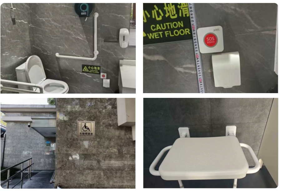 走访调研10余处公园绿地后,公益检察官发现,类似“L型抓杆”般失之毫厘的细节,也存在于其他公共卫生间内:有的坡道缺乏清晰的无障碍标识,有的未设置可供倚靠的多功能台,有的救助呼叫装置设置偏高。