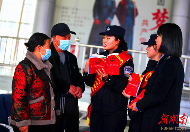 图为12月4日,怀化站派出所民警走进候车室,对广大旅客进行宪法知识宣传。(通讯员 刘亚平 黄心叶 摄影报道)