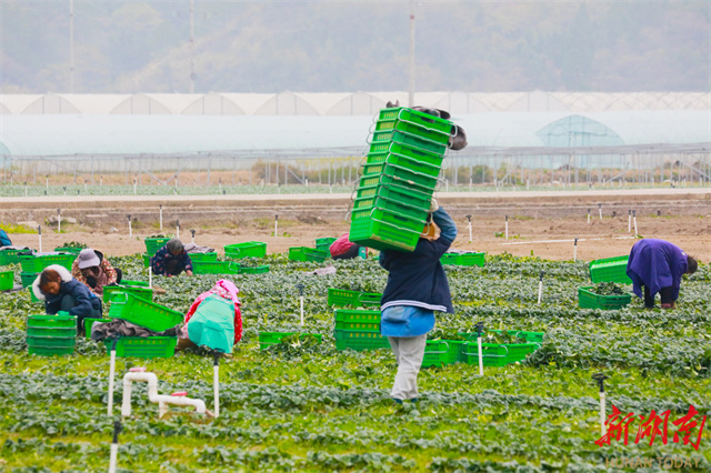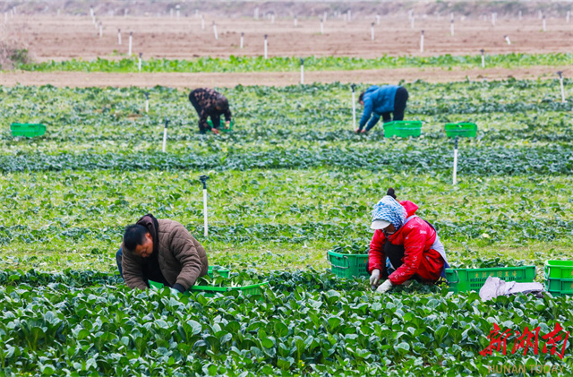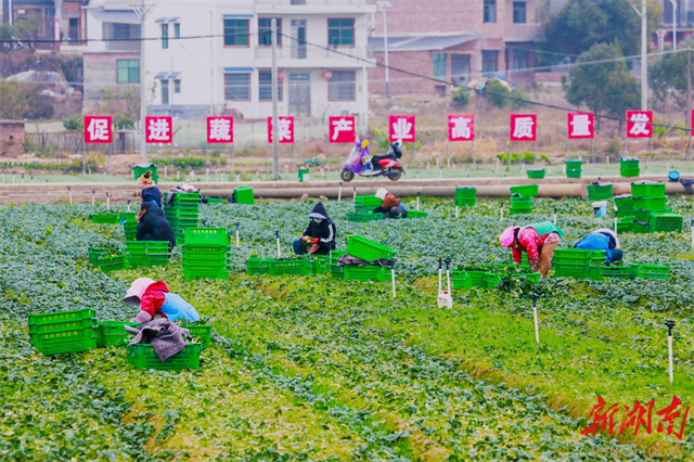 The photo, taken on December 3, shows villagers harvesting vegetables at Gangshang Village, Zhongshan Neighborhood, Xintian County. In recent years, the county has fully leveraged its selenium-rich soil resources, forged direct supply links with the Guangdong-Hong Kong-Macao Greater Bay Area for its vegetables, and adopted a "rice + vegetable" rotation mode to vigorously develop winter vegetable cultivation. This initiative ensures year-round farmland utilization, effectively boosting agricultural efficiency and increasing farmers' income. (Photo/Liu Guixiong)