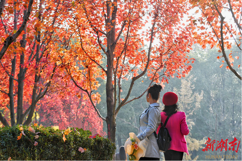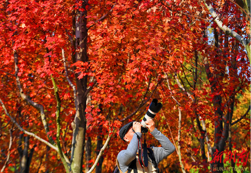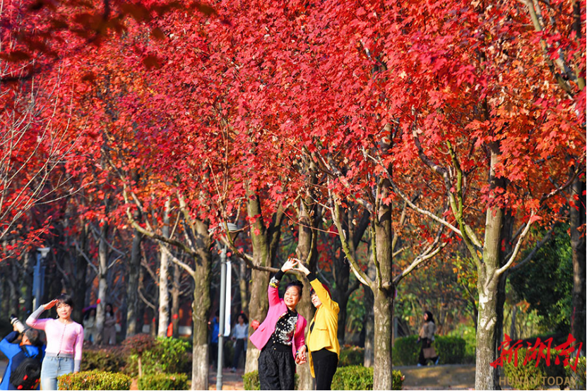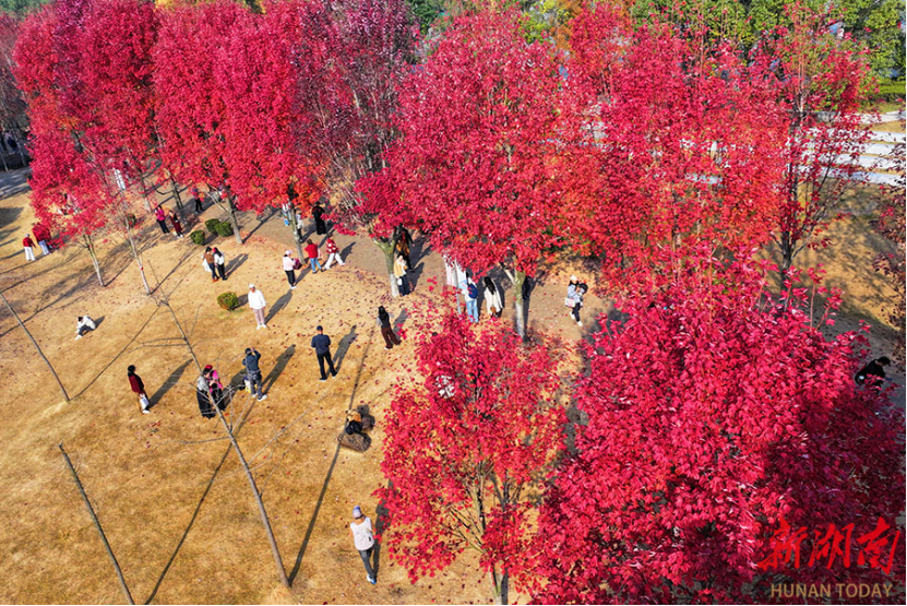 The photo shows residents and tourists taking photos beside rows of red maple trees on the campus of Hunan Agricultural University, Changsha City. From November to December every year, more than a hundred North American red maple trees near the university library blaze with fiery red hues, becoming a stunning winter attraction on campus. (Photo/Xu Xing, Hunan Daily)