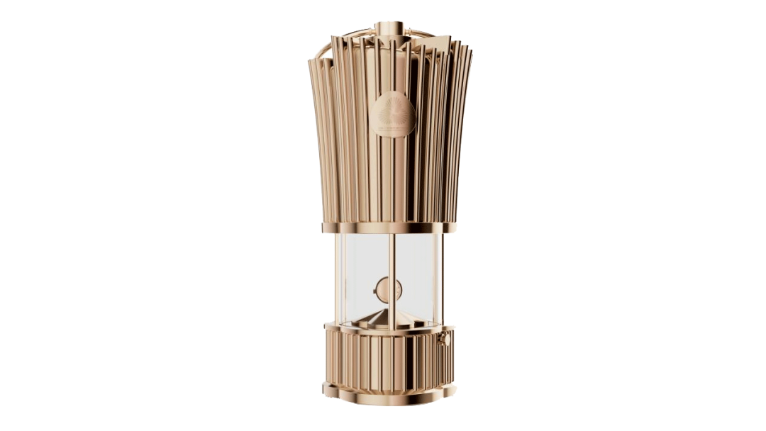 上部为会徽形状,中部为耐高温高透玻璃与象征粤港澳三地的三根支柱,共同构成火种展示区。下部为支撑粤港澳三地的三瓣底座,用于支撑火种。顶部为环形提手。整体来看,底部汇聚如火种,顶部舒展似火焰,流畅的渐变线条勾勒出动态升腾之姿,三根支柱支撑起顶部三瓣礼花。点燃后,光线穿透灯体,内部精密折射结构使光源展现粒子散射效果,宛若无数运动员精神火花在此汇聚绽放,为前行之路提供恒久的精神指引。