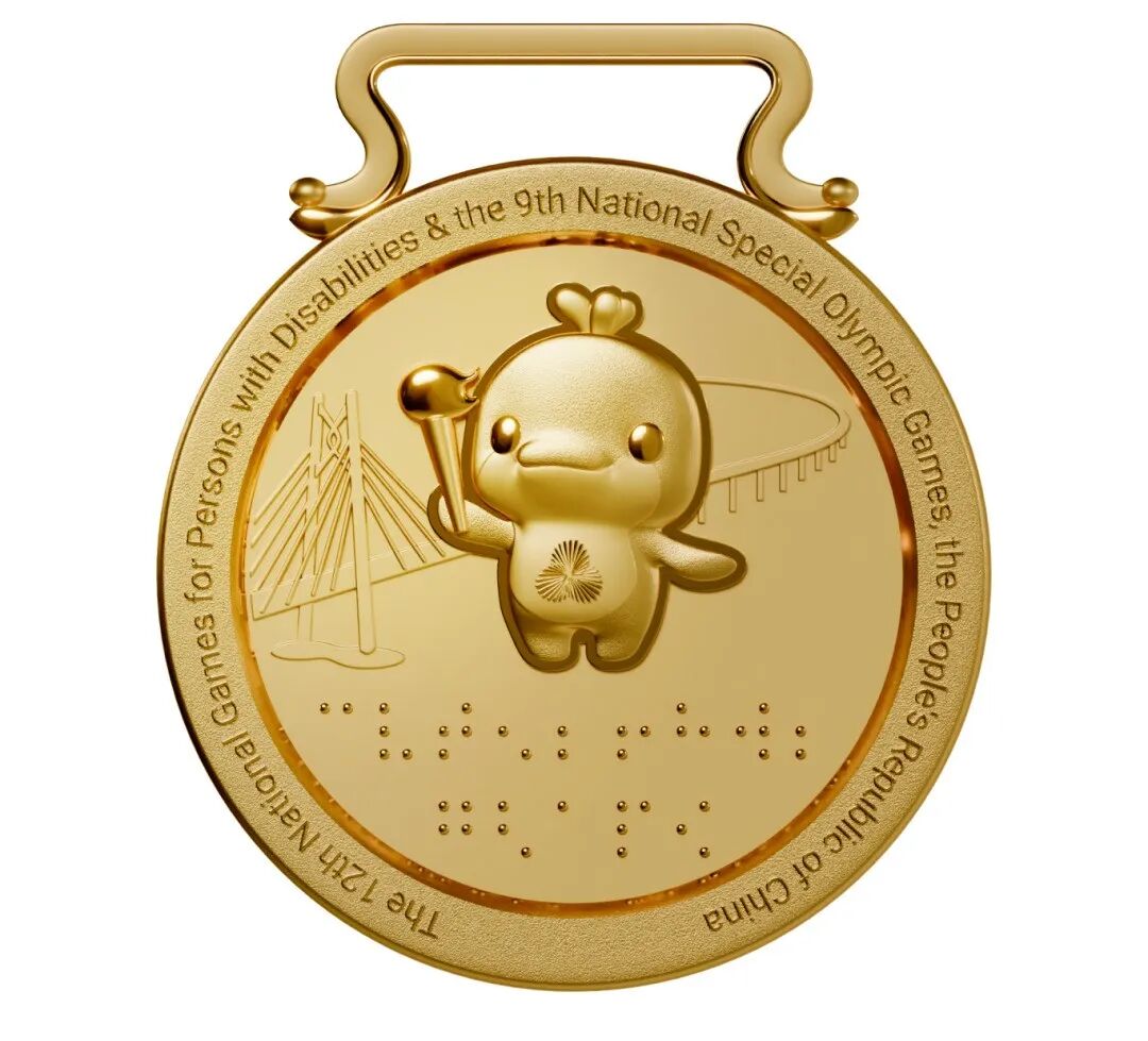 奖牌背面,中华白海豚浮雕,吉祥物高擎火炬,象征奥林匹克精神生生不息、代代相传。浮雕下方创新性地应用了盲文(第一行“残特奥会”,第二行分别为“金牌”“银牌”“铜牌”)。体现了对参赛者的用心与尊重,让视障运动员能够亲手触摸这份沉甸甸的荣耀,真切感受属于他们的荣光。背景上的港珠澳大桥是圆梦桥、同心桥、自信桥、复兴桥,体现了逢山开路、遇水架桥的奋斗精神,体现了我国综合国力与自主创新能力,体现了勇创世界一流的民族志气,传递着同心携手、融合发展的图景。