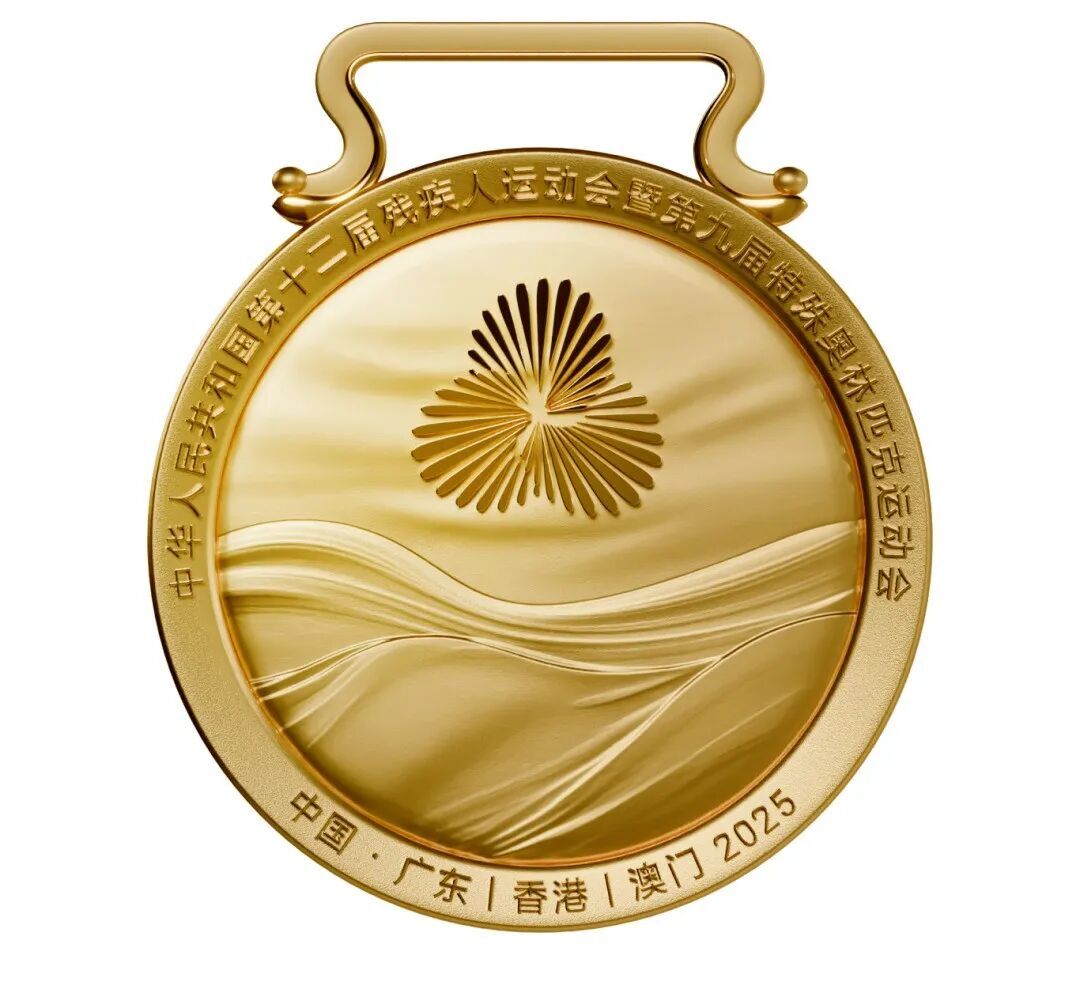 奖牌正面,精心镌刻的连绵海浪纹,象征着大海的广阔与包容,传递着残特奥会汇聚万众一心、众志成城的力量,更代表着运动员们破浪前行、永不言弃的意志与激情。奖牌设计融合传统与现代,一边是承载历史的岭南镬耳屋,一边是象征活力湾区的澎湃海浪,如同港珠澳大桥与岭南建筑跨越时空对话。