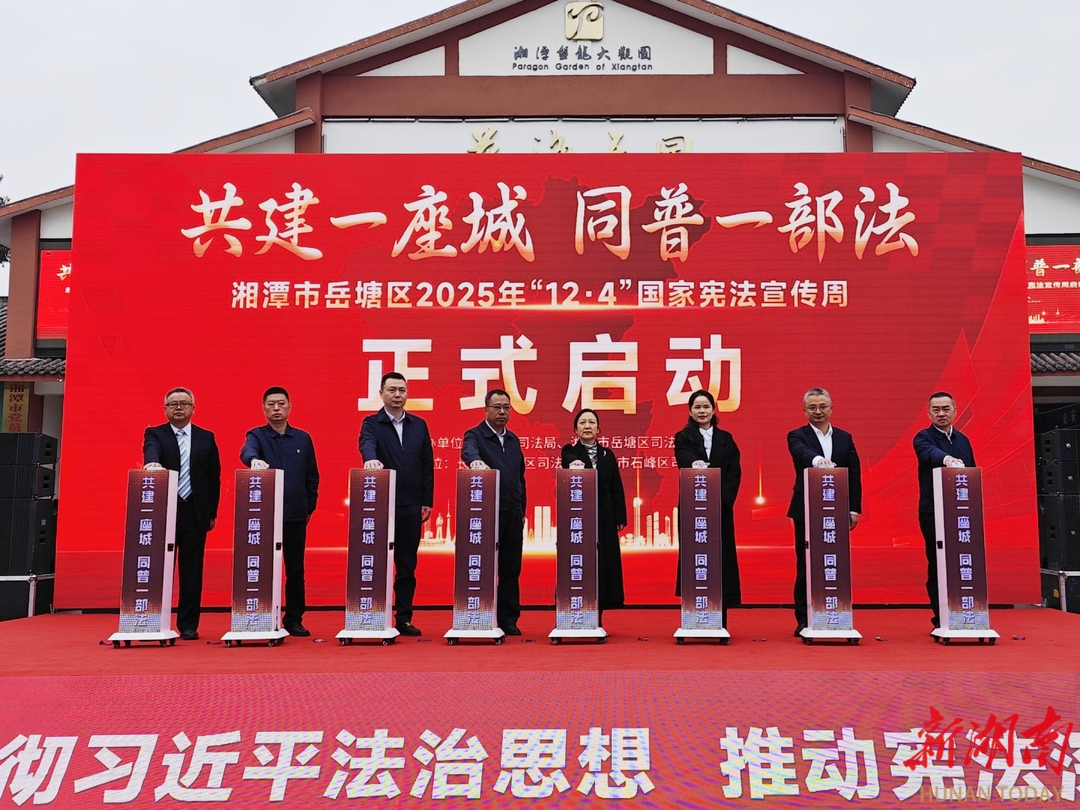 湖南日报·新湖南客户端12月4日讯(记者 彭婷 通讯员 朱柏燃 朱维)12月1日至7日是“宪法宣传周”,12月4日是国家宪法日。今天上午,以“共建一座城·同普一部法”为主题的国家宪法宣传周启动仪式,在湘潭盘龙大观园举行。此次活动在湘潭市司法局指导下,由湘潭市岳塘区、长沙市天心区、株洲市石峰区三地司法行政部门联合举办,标志着长株潭区域法治协同迈入新阶段,将为长株潭都市圈建设注入坚实的法治动能。