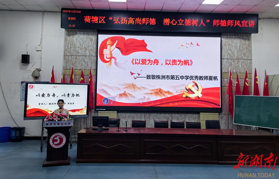 湖南日报·新湖南客户端12月4日讯(通讯员 杨婷玉)12月4日下午,株洲市荷塘区“弘扬高尚师德 潜心立德树人”师德师风宣讲活动(初中场)在株洲市第五中学多媒体教室温情启幕。荷塘区教育局党委副书记、副局长潘书巧,局人事股、局党政办工作人员,各初中学校书记、校长、专职副书记、中层干部、教师代表及宣讲团成员齐聚一堂,共同参与这场以教育为名、以师德为核的温暖对话。