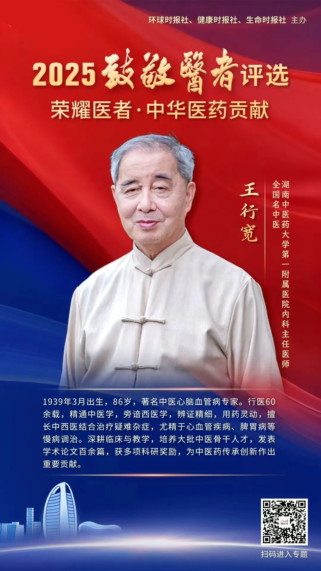 全国名中医、湖南中医药大学第一附属医院内科主任医师王行宽教授荣获“荣耀医者·中华医药贡献”荣誉称号。
