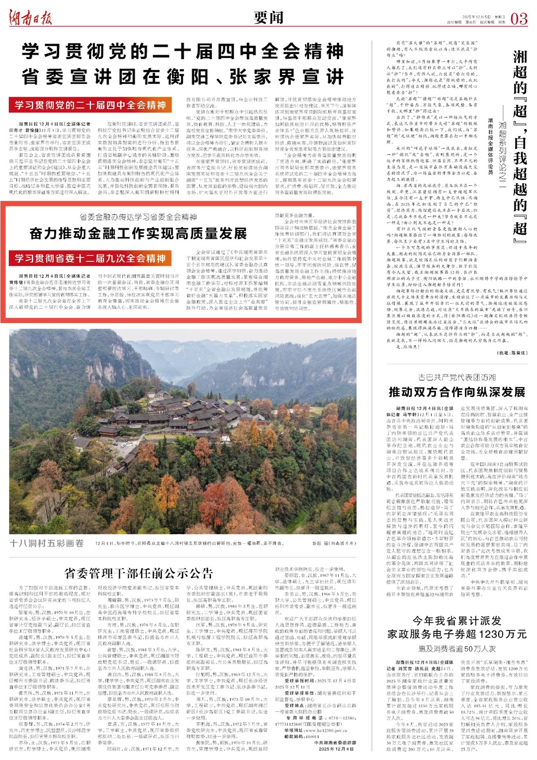全会审议通过了《中共湖南省委关于制定湖南省国民经济和社会发展第十五个五年规划的建议》。省委金融办认真领会全会精神,通过深学细悟,奋力推动金融工作实现高质量发展;紧密结合湖南金融工作实际,对标对表正抓紧编制“十五五”全省金融业发展规划,并统筹做好金融“五篇大文章”,积极落实国家金融政策,深入推进企业上市“金芙蓉”跃升行动,为全省经济社会高质量发展贡献更多金融力量。