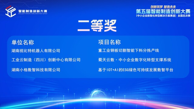 激烈的竞争中,湖南企业的创新实力得到充分展现。湖南视比特机器人有限公司和湖南小格数智科技有限公司荣获全国二等奖;衡阳镭目科技有限责任公司、湖南中南智能装备有限公司、湖南深拓智能科技股份有限公司、衡阳众德智能科技有限公司斩获全国三等奖。获奖项目涵盖智能机器人、工业互联网平台、高端检测系统等多个前沿领域,展现出“智造湘军”深厚技术积累。