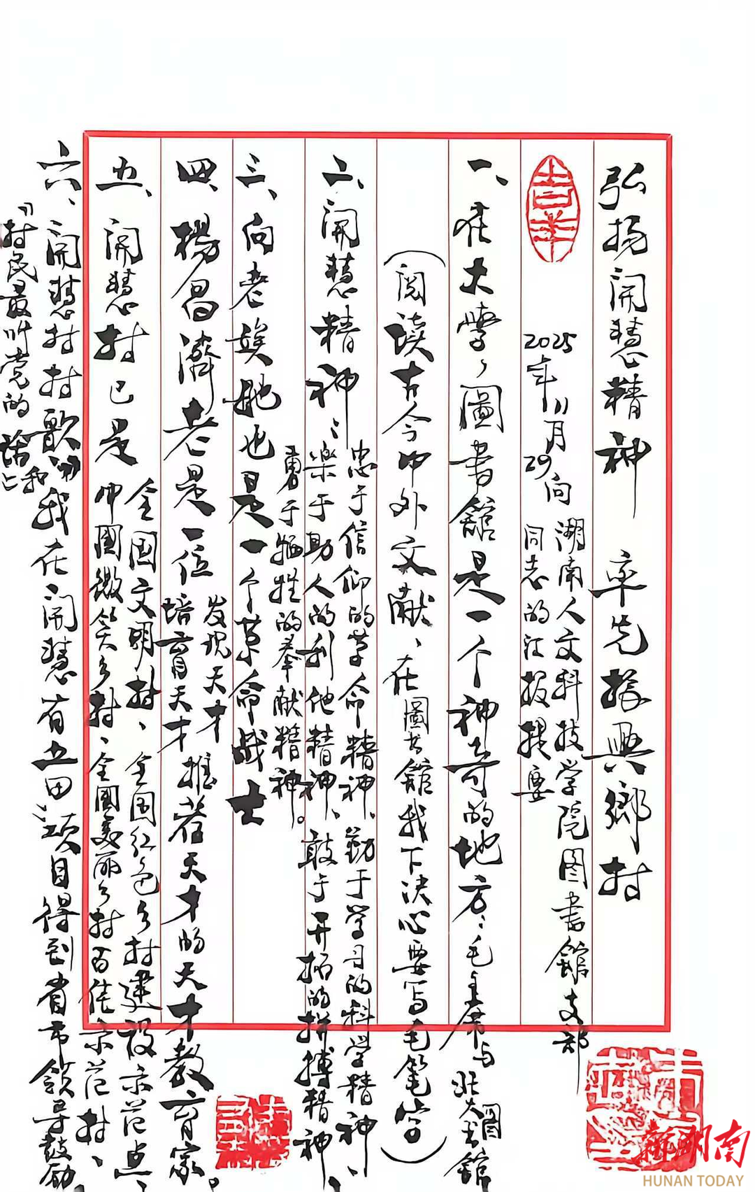参观结束后,开慧村党支部第一书记朱有志作了题为《弘扬开慧精神,率先振兴乡村》的党课。生动讲述了革命领袖毛泽东与图书馆的不解之缘;讲述了开慧村总结提炼的关于开慧精神的五个内涵:忠于信仰的革命精神、勤于学习的科学精神、乐于助人的利他精神、敢于开拓的拼搏精神、勇于牺牲的奉献精神;讲述了教育家杨昌济先生的革命育人情怀;讲述了他以共产党人的情怀,16年如一日扎根开慧村这片红色土地,以党的农业现代化建设创新理念带领乡村振兴致富的经历。课后,朱有志为学校图书馆捐赠了他的专著《开慧村语》系列图书。