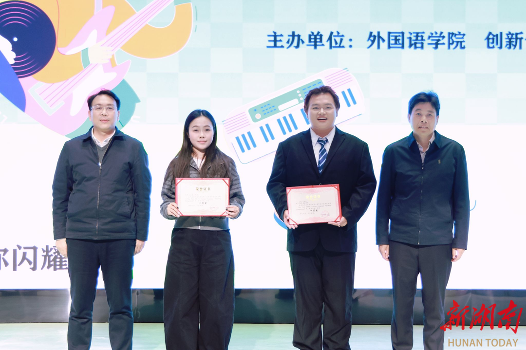 经评审,大赛共评出一等奖2项、二等奖3项、三等奖5项及优胜奖6项。其中,《My Hometown Cuisine》《独立的启示》荣获一等奖。与会领导为获奖选手颁奖。