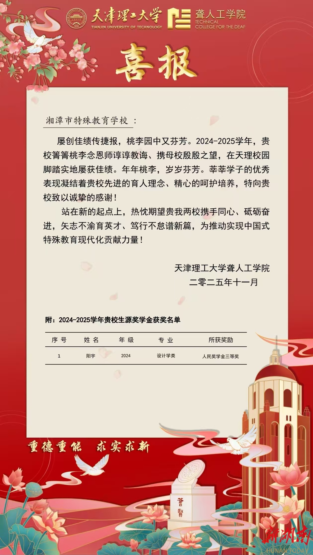 新湖南客户端12月10日讯(通讯员:陈静)近日,湘潭市特殊教育学校收到来自天津理工大学聋人工学院的喜报——2024级高中毕业生阳宇同学凭借优异表现,荣获“人民奖学金三等奖”。这份跨越千里的认可,不仅是对学子奋发图强的嘉奖,更是对我校“让每个生命拥有绽放的机会”这一办学理念的生动印证。