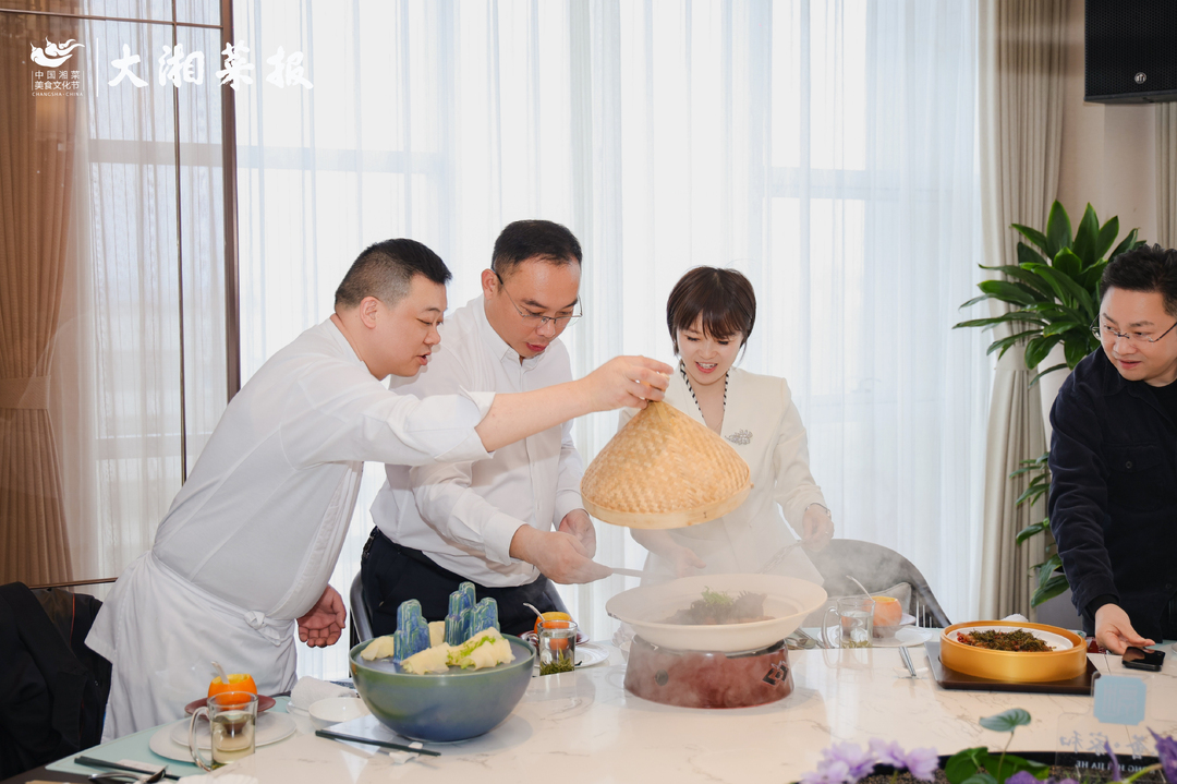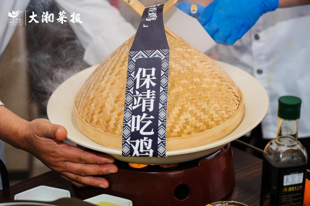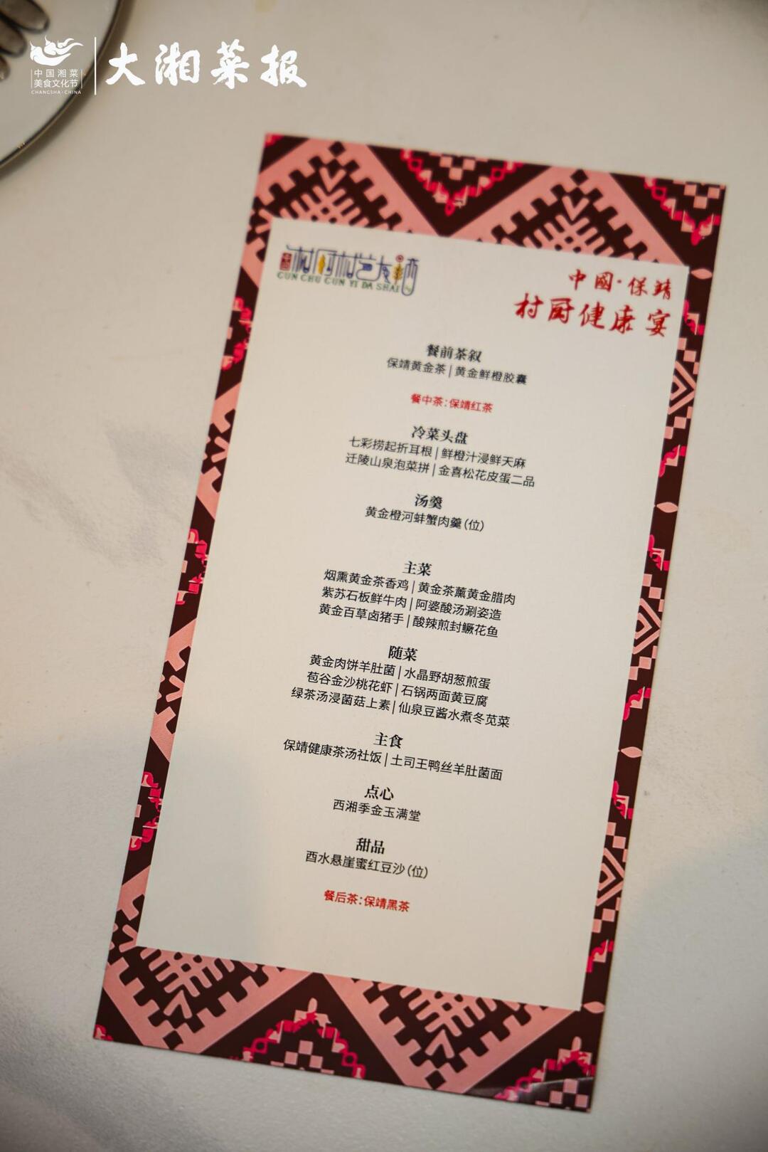 盛典期间,由保靖县人民政府委托湖南省旅游饭店协会星厨委等机构研发的“中国·保靖 村厨健康宴”也进行了发布与试菜,这是该县近年来计划重点打造的特色餐饮品牌。这桌菜以保靖当地出产食材为原料,结合传统与创新的烹饪技艺,创造出“烟熏黄金茶香鸡”“黄金茶熏黄金腊肉”“黄金百草卤猪手”“仙泉豆腐水煮冬苋菜”和“保靖健康茶汤社饭”等14道核心菜品。