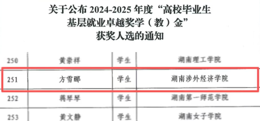 新湖南客户端12月10日讯(通讯员 任燕荷)近日,中国教育发展基金会正式公布了2024-2025年度“高校毕业生基层就业卓越奖学(教)金”获奖名单,湖南涉外经济学院2020届毕业生方雪郦喜获嘉奖。方雪郦同学是本年度全国获奖者中唯一一位来自民办本科院校的毕业生,充分彰显了该校在引导和支持毕业生投身基层、服务社会方面所取得的突出育人成效。