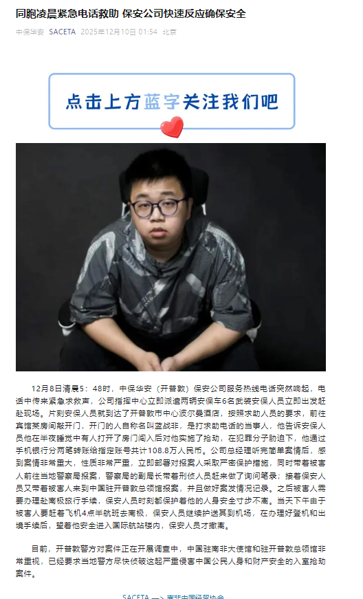 12月10日凌晨,南非中国经贸协会发文《同胞凌晨紧急电话救助 保安公司快速反应确保安全》,文中写道:中保华安(开普敦)保安公司接到自称蓝战非的人打来求助电话,称自己被犯罪分子胁迫,转账共计108.8万元人民币。该公司保安人员带着被害人报警后,又到中国驻开普敦总领馆报案,并且做好案发情况记录。中国驻南非大使馆和驻开普敦总领馆非常重视,已经要求当地警方尽快侦破这起严重侵害中国公民人身和财产安全的入室抢劫案件。