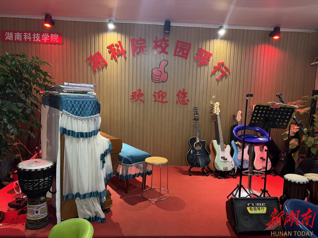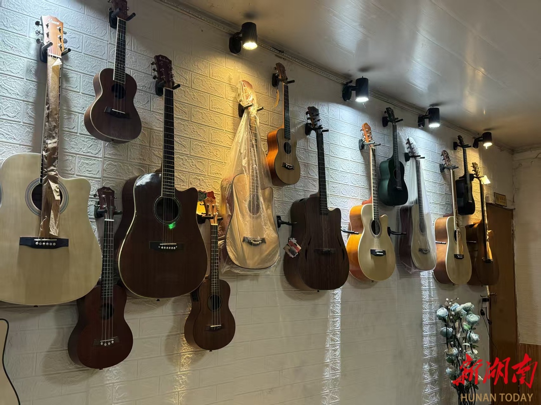 当“内卷”成为大学校园的高频标签,绩点排名、竞赛证书、实习offer填满了学生的日程表,焦虑与疲惫似乎成为了青春的附属品。在这样的时代浪潮下,赖楚生早在大三时便带着一把陪伴了他多年的吉他,在熟悉的校园里创办了“湘科院校园琴行”。15年过去了,琴行已搬迁到湖南科技学院校门口,店里没有刺眼的招生海报、考级冲刺的标语,只有暖黄的灯光、错落的绿植和流畅的弦音。它不仅是乐器教学空间,更是大学生逃离内卷、安放心灵的“精神栖息地”。