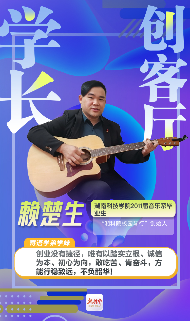 赖楚生,湖南科技学院2011届音乐系毕业生,现为“湘科院校园琴行”创始人。曾获湖南科技学院校园琴行艺术节大赛二等奖、三等奖,2022年永州市零陵区校园琴行教学示范基地优秀指导教师奖。