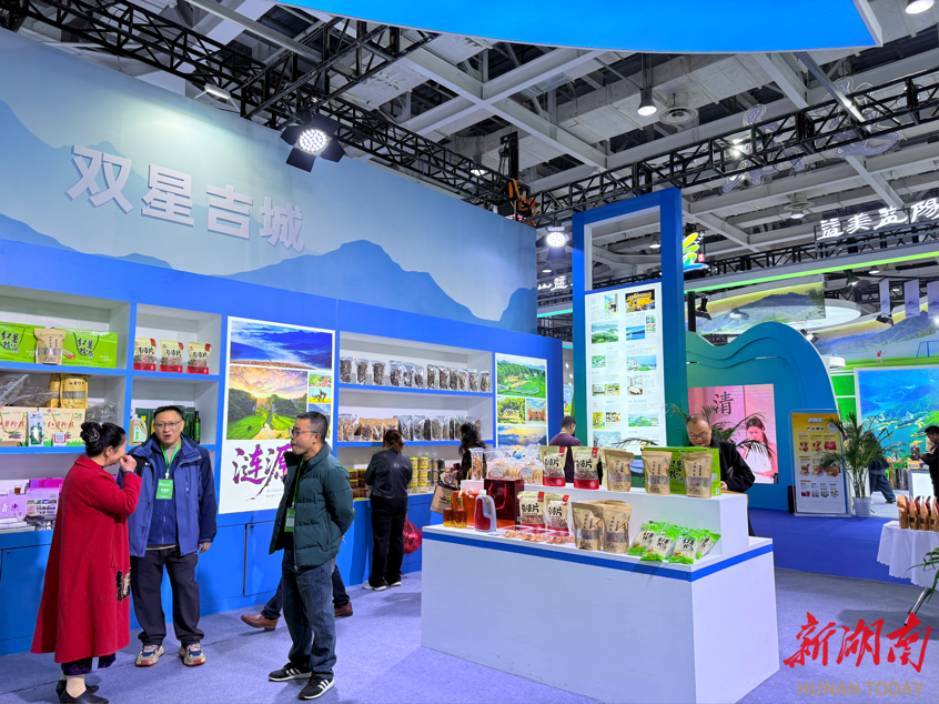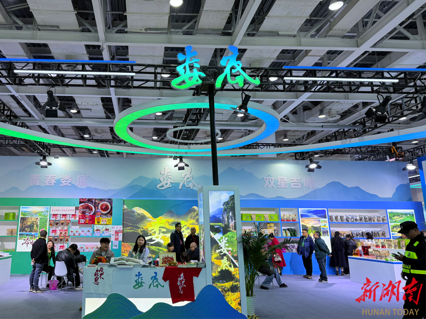 各区县的特色文旅产品在展区内各展所长。娄星区带来都市文旅体验线路及文创周边,展现中心城区的文旅消费新场景;冷水江市主打波月洞溶洞文旅衍生品、锑文化创意摆件,同时带来了本地特色的花桥铺里手工麻辣;涟源市展出湄江风景区的生态旅游纪念品、龙山特色农产品,让观众直观感受湘中自然山水的魅力;双峰县推出曾国藩故居文创、永丰辣酱等非遗美食,传递梅山文化与湖湘人文底蕴;新化县则以黑茶、梅山剪纸、紫鹊界梯田主题文创为核心,尽显梅山文化的独特韵味。