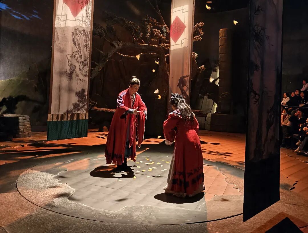 本次演出的沉浸式体验令人耳目一新。462平方米的老剧场被改造为充满巧思的幻境空间,实景融合裸眼3D技术勾勒出水墨国风的诗意画面,舞美机械与威亚特效暗藏玄机,带来接连不断的惊喜。四大观演结界的设计,让每位观众都仿佛亲身步入一个独一无二的秘境。而剧中巧妙融入的花鼓戏、湘绣、竹编等非遗元素,在精美服化道与现代科技的加持下,焕发出震撼人心的东方之美与湖湘底蕴。