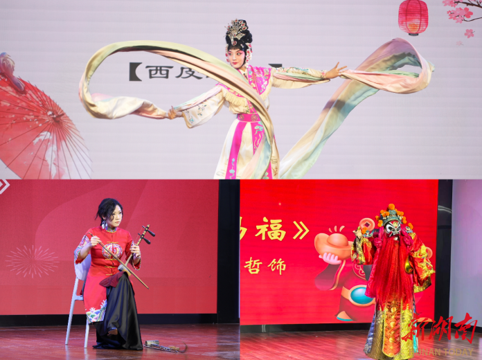 演出正式拉开帷幕,一系列经典剧目轮番登场,尽显京剧艺术魅力。开场曲《夜深沉》奏响时,大鼓独奏与京胡合奏相得益彰,刚劲优美的旋律瞬间将观众带入京剧艺术的独特意境。紧接着,《天女散花》演员身着华服,以梅兰芳先生独创的长绸舞演绎经典,仙袂飘飘间尽显古典之美。随后,《财神赐福》表演中,财神爷富态可掬,踏着喜庆锣鼓节拍派送金元宝,将吉祥寓意传递给现场每一位观众以互动送福的形式传递吉祥寓意,点燃现场氛围。国宝绝活《变脸》惊艳亮相,瞬息间变幻十余张脸谱,“飞脸”绝技引得全场掌声不断。最后,武戏《挡马》由武旦、武丑搭档演绎,以精湛的程式化表演展现京剧虚拟性特色,精彩的对打场面让观众目不转睛。