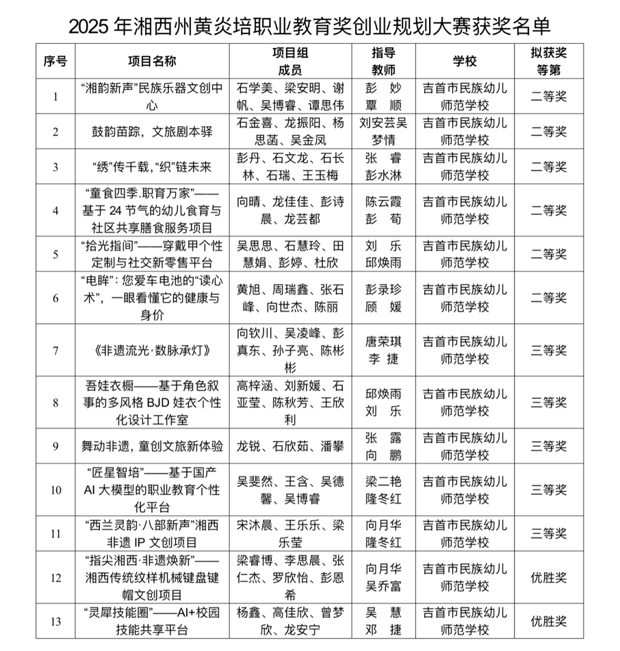在2025年湖南省黄炎培职业教育奖创业规划大赛湘西州选拔赛中,吉首幼师学子再创佳绩,共有13个学生创业团队获奖,包括二等奖6项、三等奖5项、优胜奖2项。其中,“‘湘韵新声’民族乐器文创中心”等3个项目成功晋级,将代表湘西州参加省级决赛。这些项目聚焦湘西本土文化,涵盖非遗文创、文旅融合、社区服务及人工智能等领域,彰显了学生立足地方、勇于创新的创业精神和实践能力。