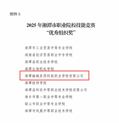 近日,2025年湘潭市职业院校学生技能竞赛获奖名单正式公布。湘潭融城医药科技职业学校在本次竞赛中表现突出,荣获团体总分一等奖、优秀组织奖与优秀赛点三项集体荣誉,参赛学生共取得1金、7银、11铜的佳绩,成为本届赛事获奖数量最多的院校之一。