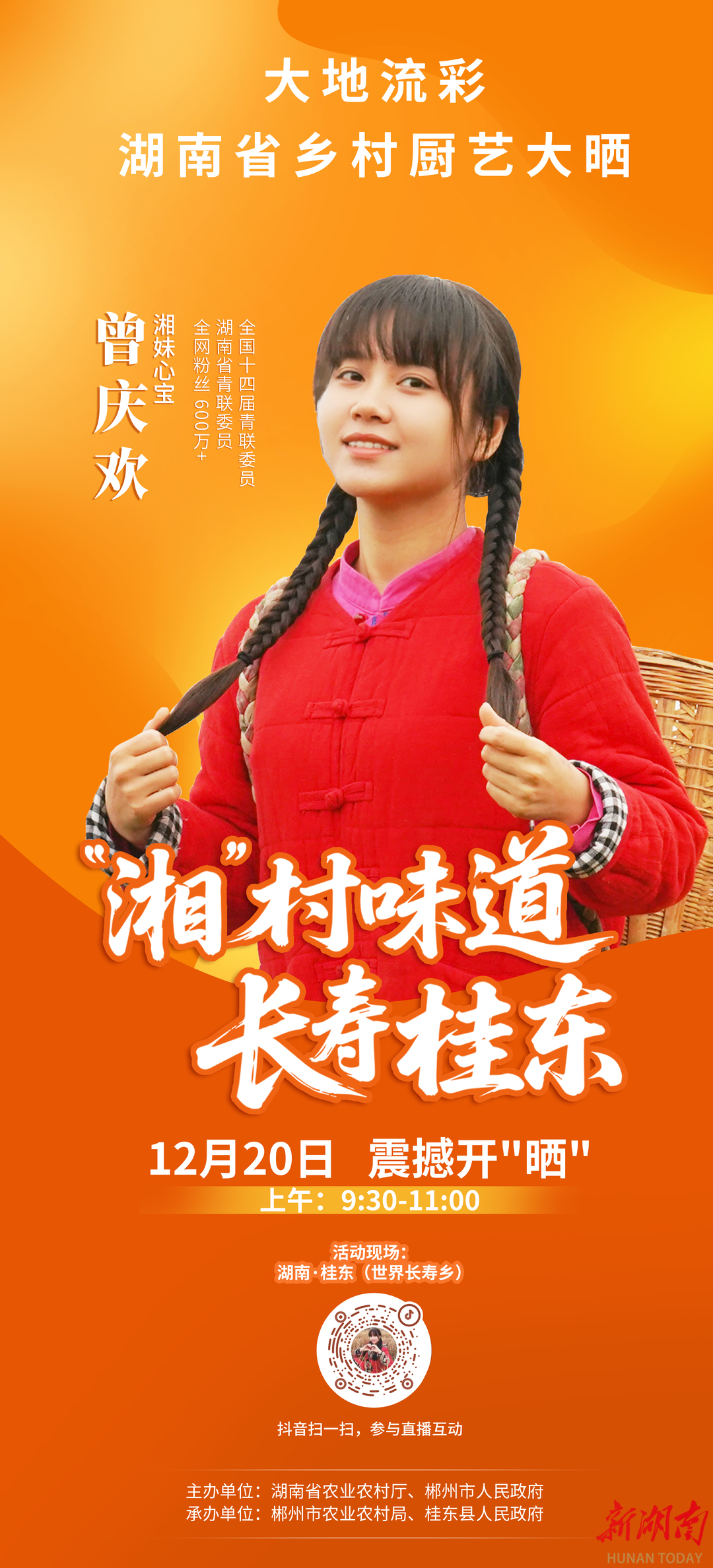 现场有地域风情文艺表演、“桂东好材”品牌发布,更有有奖问答与抽奖福利。全国十四届青联委员、全网600万+粉丝达人“湘妹心宝”将于9:30-11:00在抖音直播直击“晒”况精华,抖音扫码即可围观厨艺对决,尽观热气腾腾的湖南“湘”村味道,见证乡村美味与振兴力量!