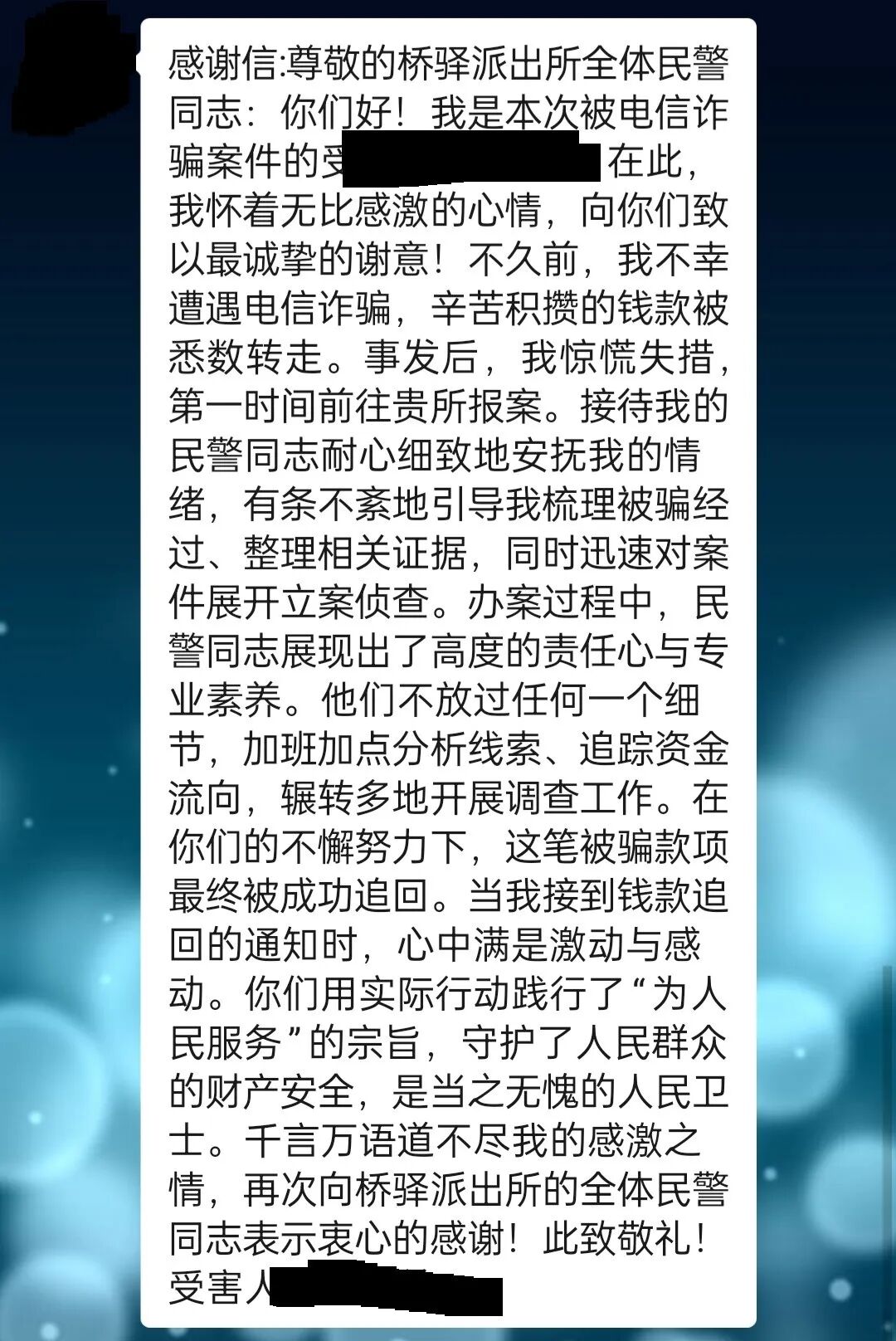 刘女士在感谢信中写道:“你们真正做到了人民警察为人民,守护了我们普通百姓的血汗钱”
