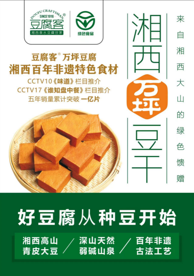 如今的“豆腐客”万坪豆腐,早已走出湘西大山,收获诸多认可。产品先后斩获中国中部(湖南)农业博览会“金奖”,通过绿色食品认证,更获央视十套《中国年味・湘西》、央视十七套《谁知盘中餐》等节目隆重推介。