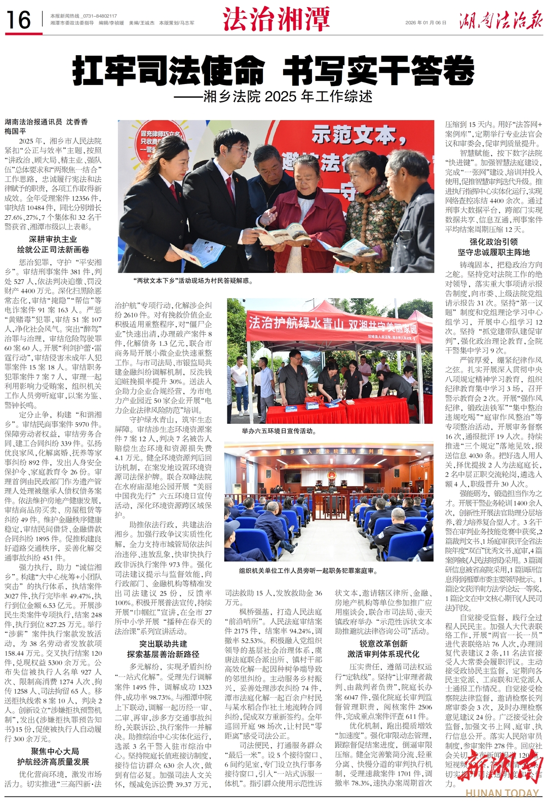 2025年,湘乡市人民法院紧扣“公正与效率”主题,按照“讲政治、顾大局、精主业、强队伍”总体要求和“两聚焦一结合”工作思路,忠诚履行宪法和法律赋予的职责,各项工作取得新成效。全年受理案件12356件,审执结10484件,同比分别增长27.6%、27%,7个集体和32名干警获省、湘潭市级以上表彰。