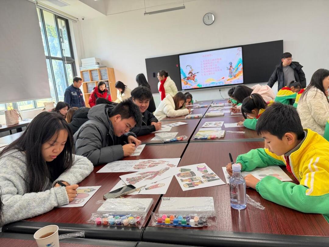 在随后的“皮影制作工坊”中,闫家溶完小的指导老师从选皮、画稿、镂刻到敷彩、缀结,逐步演示皮影制作的核心技艺。高校学生们围坐观摩,并在指导下亲手尝试雕刻与涂色,沉浸式体验非遗背后的匠心与智慧。“原来一个小小的皮影要经过这么多道工序,孩子们能坚持学习并演绎得这么好,真了不起!”一名参与体验的大学生感叹道。