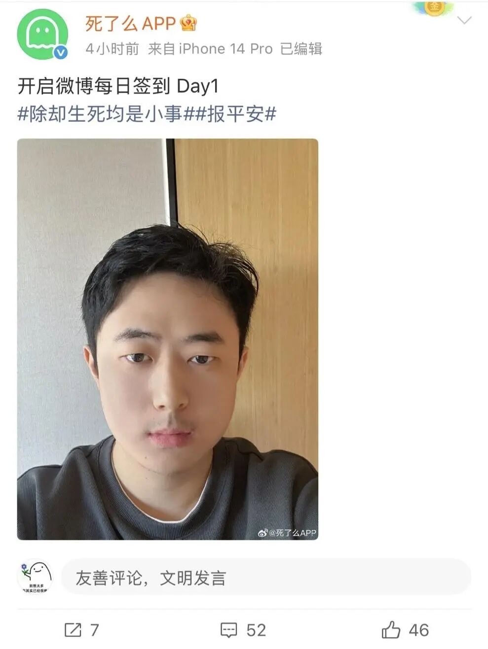 1月15日,南都N视频记者检索苹果应用商店发现,“死了么”App已经被下架,无法搜索下载。同时,还出现了许多类似App,例如“活着么-死了么短信版”“Dead Yet?Pro”“死了么漂流版”等。红星新闻记者检索安卓应用商店,也无法搜索下载。15日,“死了么”App账号发帖称,开启微博每日签到Day1,并附上“除却生死均是小事”“报平安”的话题,配了一张自拍照。另外,记者发现,“死了么”创始人吕先生的微信昵称增加了“决定公开露面”。