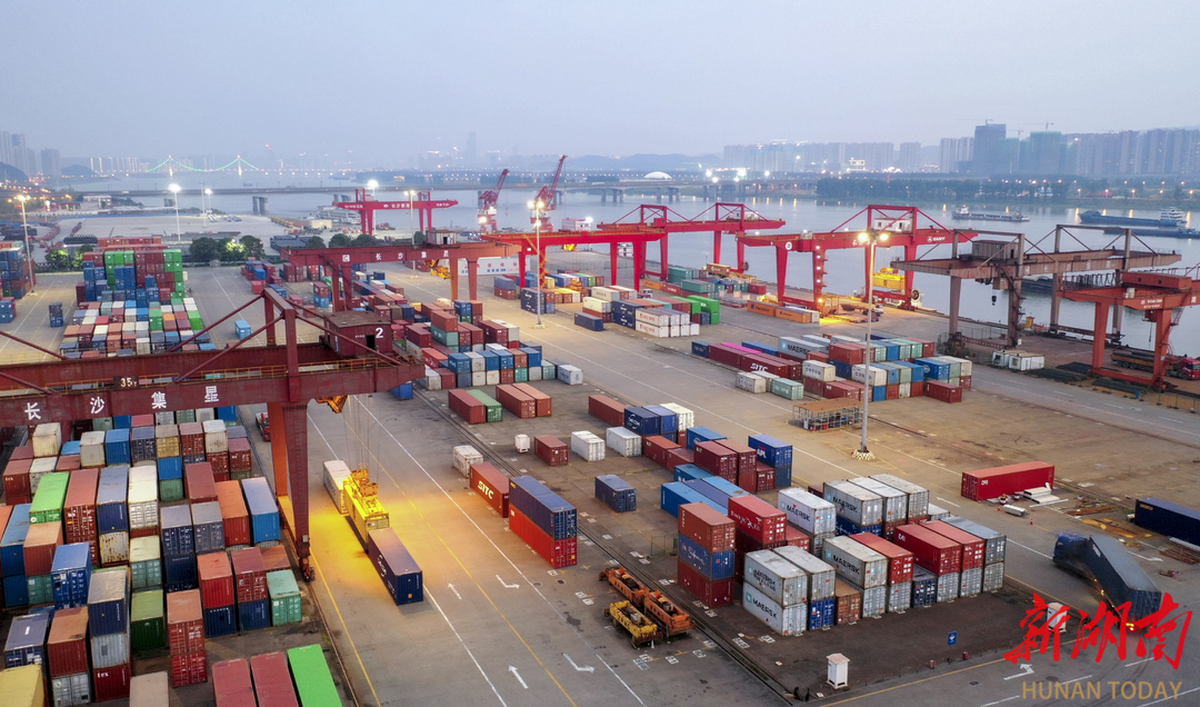 (暮色下的长沙新港码头一片繁忙景象。 湖南日报全媒体记者 辜鹏博 摄 )