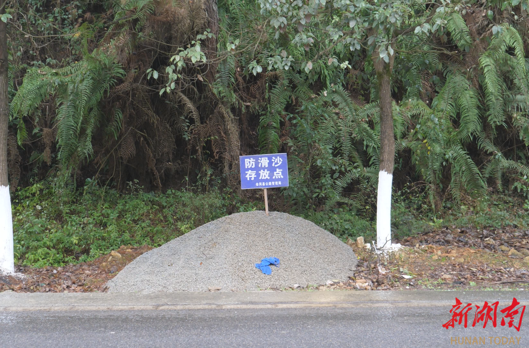 在G209国道鹰嘴岩急弯处,工作人员小心翼翼地将写有“路面结冰 谨慎驾驶”的警示牌牢牢固定在路肩,提醒过往车辆注意安全。记者在现场看到,各个存在冰冻隐患的路段旁,都堆放着防滑沙,以备不时之需。