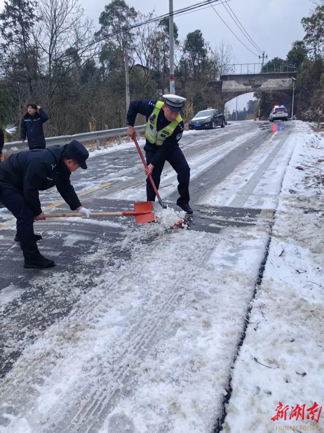 桃源县三阳港派出所与交管中队民、辅警配合镇党委政府铲雪和撒盐。