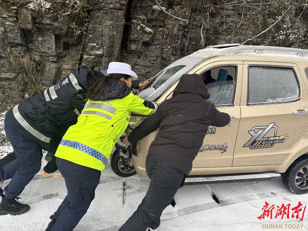 1月20日,“天险公路”出现车辆被困情况。吉首市公安局矮寨交警徒手推车,帮助车辆成功脱困。