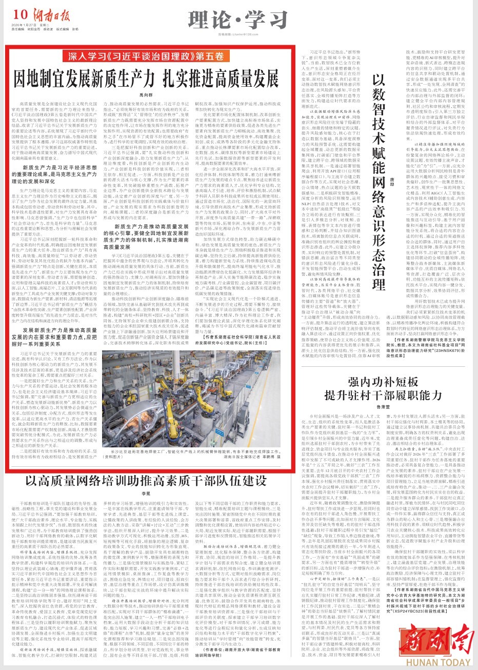 学习《习近平谈治国理政》第五卷,关键在于把握其中蕴含的世界观与方法论,并将其转化为推动湖南高质量发展的具体行动。当前,新质生产力已经在实践中形成并展示出对高质量发展的强劲推动力、支撑力。对湖南而言,要加快健全因地制宜发展新质生产力的体制机制,持续培育发展新质生产力,推动经济实现质的有效提升和量的合理增长。