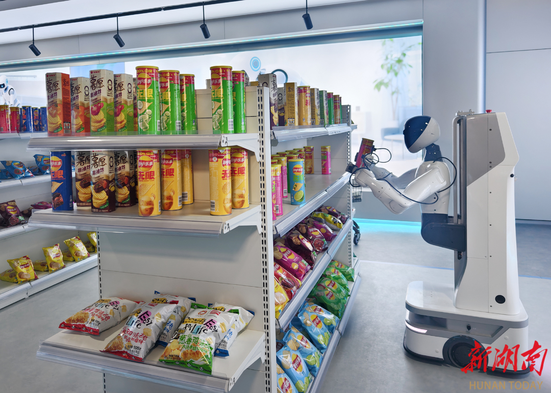 1月16日,位于长沙经开区的湖南具身智能创新中心,机器人正在模拟无人超市环境中进行配货作业。湖南日报全媒体记者 范远志 摄