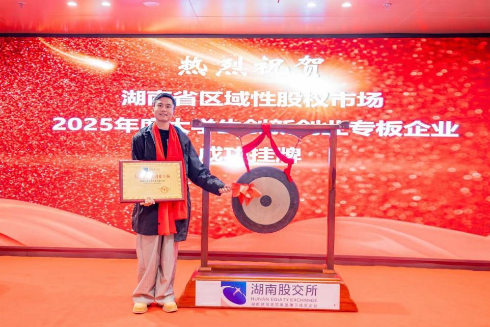 从母校出发,他的脚步正迈向更广阔的舞台。2025年9月,宋宏霖创立的公司在湖南股权交易所大学生创新创业专版挂牌;四个月后的授牌仪式上,他接过了那块标志性的牌匾。这位年轻创业者与他的团队,以“轻量化定制”为切入点,正走出一条属于自己的文创新路径。
