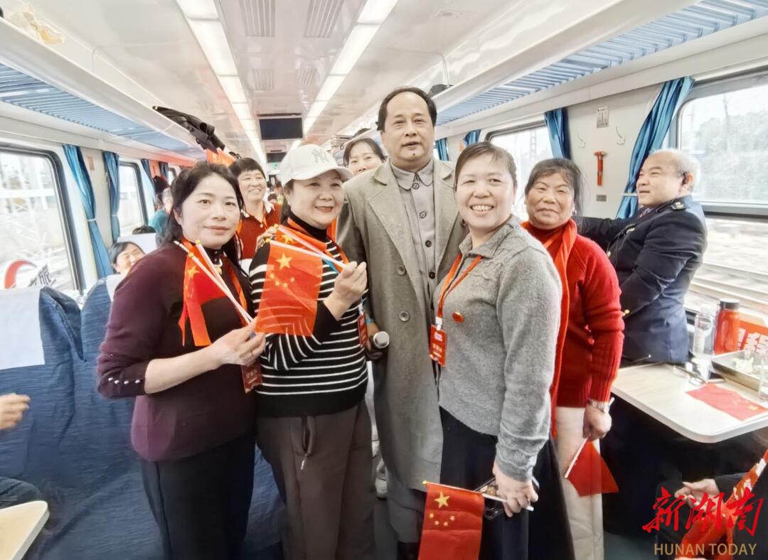 红友专列车身车内处处充满红色元素。“中华人民共和国中央人民政府今天正式成立了……”刚踏上列车,车厢内电视屏幕正播放1949年10月1日开国大典影像,喇叭里传来毛主席那沧桑有力的世纪之音,今天依然让人心潮澎湃。不一会,两位特型演员扮演不同时期的毛主席出现在每一节车厢里,就像梦里时空穿越,与伟人相遇,特型演员与红友热情互动,红友们欣喜激动争先恐后握手合影留念。一路上,每节车厢里红旗飘扬,红友们的红歌声、红色诗朗诵此起彼伏,专列就像一座“移动的红色课堂”,红友们在行走中重温红色历史,在互动中传承红色薪火。