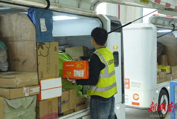 走进云溪客货邮服务中心,分拣区里一派热火朝天。工作人员戴着劳保手套,麻利地将包裹扫码分拣、套袋打包,再按配送区域整齐码放进无人快递车。“这6台无人车现在是云溪主城区快递配送的‘主力军’。”客货邮服务中心负责人姚磊指着刚装满货的无人快递车向记者介绍,“一台车每天平均能跑五趟,6台车一天就能送15000多件,占到了整个物流网点配送量的40%!”