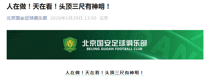 北京国安官方社交媒体以“人在做,天在看!头顶三尺有神明!”为回应。