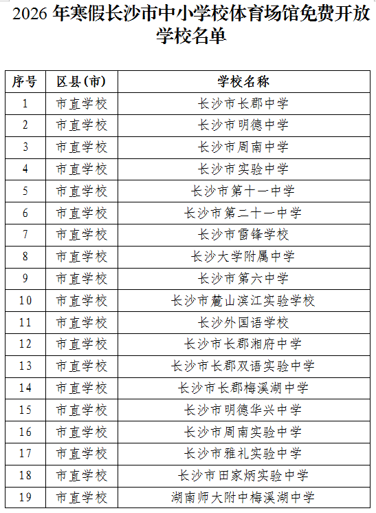 湖南日报·新湖南客户端1月31日讯(记者 肖霄)为推动全民健身运动,满足群众健身需求,缓解公共体育设施不足,2026年寒假期间,长沙市358所公办学校体育场地设施免费向社会公众开放。
