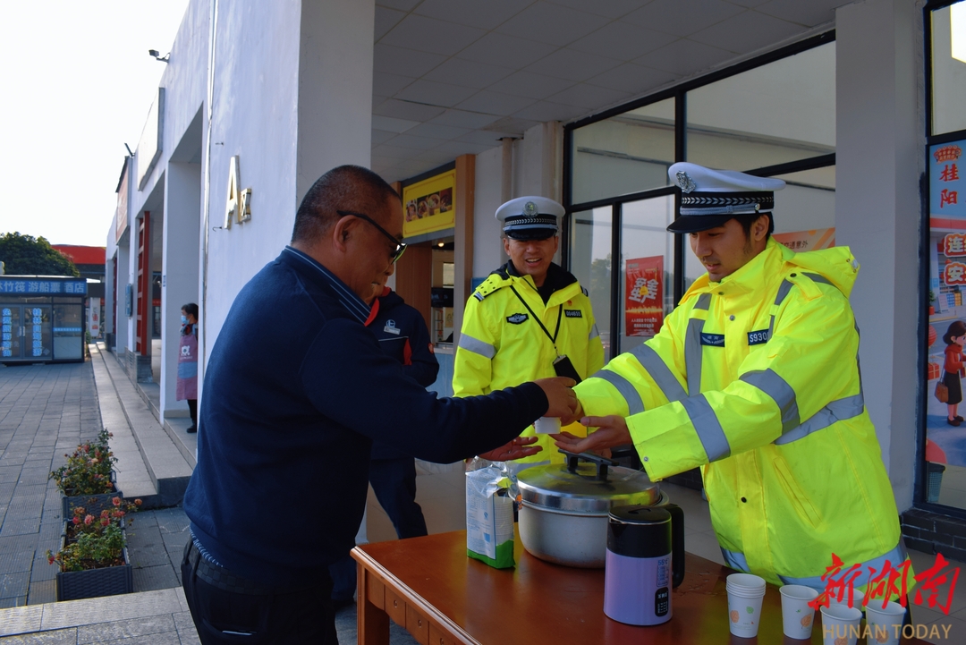 誓师仪式结束后,民辅警立即联动辖区路产、施救、养护工区等联动单位,深入桂阳服务区开展主题交通安全宣传活动。活动现场,民辅警通过发放宣传资料、现场讲解安全知识、以案示警等方式,向过往驾驶人重点讲解春运期间高速行车注意事项,普及高速交通安全“九字诀”等知识,提醒广大司乘自觉遵守交通法规,谨慎驾驶、平安出行。同时,民警精心熬制了暖心姜茶,逐一向过往司乘人员递上一杯杯热气腾腾的姜茶,驱散旅途寒意,传递新春温情。在平安出行倡议签名环节,过往旅客纷纷驻足,在倡议签名书上郑重签下自己的名字,以实际行动响应文明出行、安全驾驶的倡议,共同营造平安、有序、温馨的春运道路交通环境。