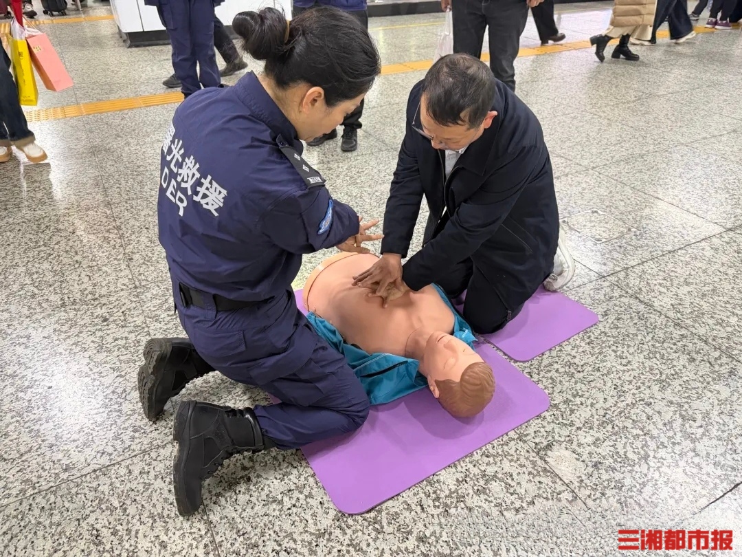 在长沙市地铁站,救援队面向过往行人开展开放式的应急救护普及活动。通过现场演示与互动教学,队员们将实用的救护技能,播撒进川流不息的人潮。当更多普通市民掌握了初步应急技能,地铁站内便增添了无数流动的“第一响应人”。