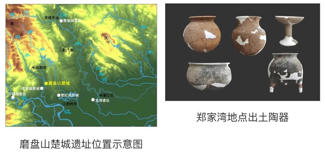 2025年6—11月,湖北省文物考古研究院联合多单位对磨盘山遗址郑家湾地点发掘,首次确认该遗址为春秋时期楚国城址,城址平面近似方形、周长8.5千米、城内总面积约4.8平方公里,东城垣依山而建,其余三面环古漳河,形成“一面依山、三面环水”的防御格局。