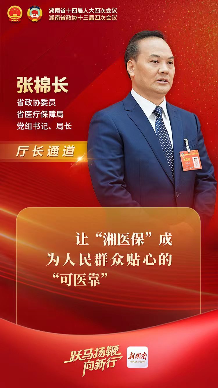 “医保深化改革、提升保障、优化服务永不止步,我们今年还将从推动存量政策落地见效和便民服务提质升级两个维度推出‘湘医保·心服务’升级版,努力让参保群众有更多的获得感,让‘湘医保’成为人民群众贴心的‘可医靠’!”2月5日上午,在省十四届人大四次会议第二场“厅长通道”上,省政协委员,省医疗保障局党组书记、局长张棉长说。