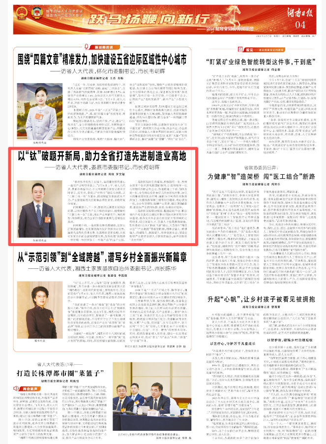 何朝晖表示,下一步,娄底将认真落实省两会部署,以钛材料作为产业升级的突破口,继续做好“三钢三电一钛”文章,推动产业向新而行、向优转型、向强蝶变,助力全省打造国家重要先进制造业高地。